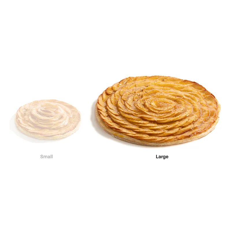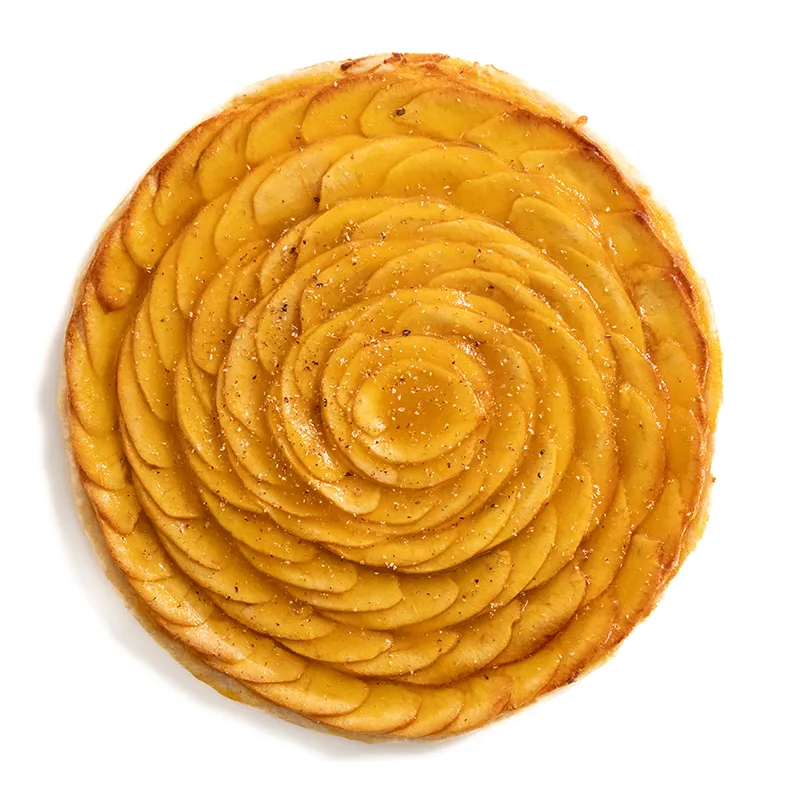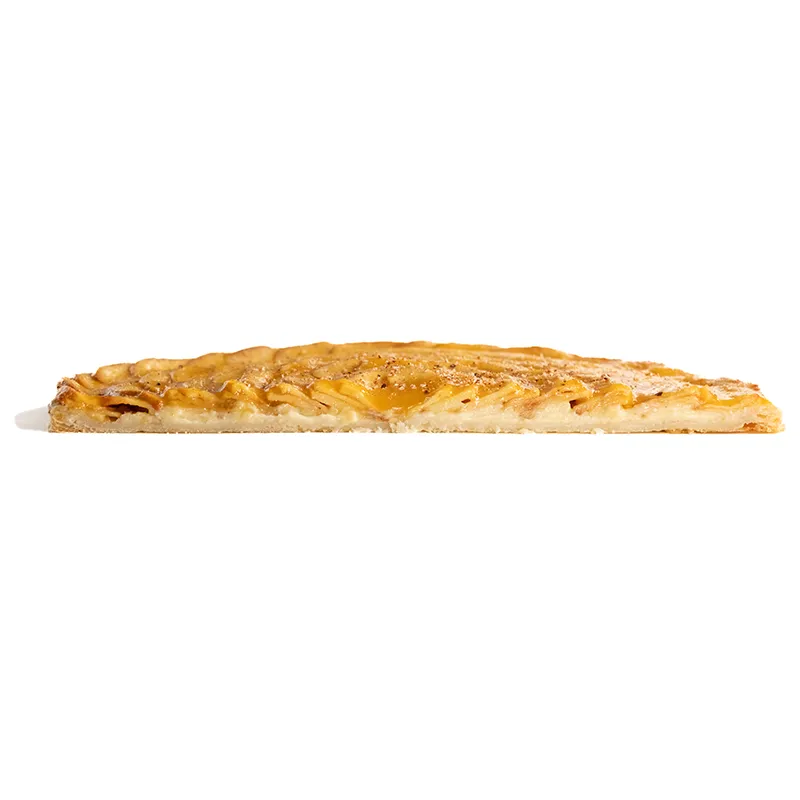 قطر حدودأ 22 سانتی متر- مناسب برای 5 تا 6 نفر. خمیر هزارلای تهیه شده با کره که با کرم پتیسیر وانیلی که با برش های نازک سیب و مارمالاد زردآلو پوشانده و با جوز هندی رنده شده تزیین می شود.