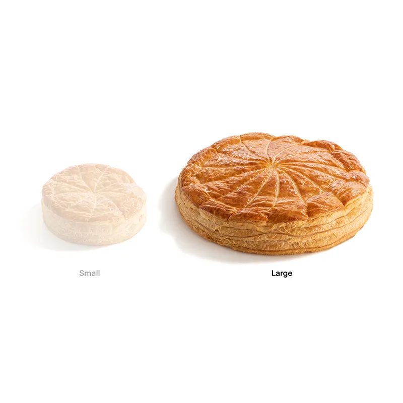 قطر حدودأ 20 سانتی متر- مناسب برای 5 تا 6 نفر. دو لایه نان هزارلای تهیهشده با کره که بین آن با کرم بادام پر میشود.